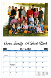 Custom 11” x 17” staple bound Wall Calendar features 13 of your 10”w x 7.5”h horizontal photos. One photo for each month & one for the cover all printed in full color. 13 sheets on 80# Matte Text stock with one line of type under each photo plus a one color ad in a 10”w x 1.25”h ad above each month in black ink. Calendar grid and ad is printed in black and PMS 300 Blue inks, see options for other imprint colors, custom date blocks and a variety of other options. Perfect size for home or office.
